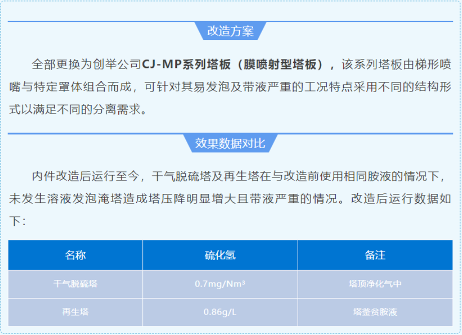 全部工程改造完工后,各項(xiàng)技術(shù)指標(biāo)均滿足生產(chǎn)要求,達(dá)到了改造的目的和預(yù)期,緩解業(yè)主單位的環(huán)保壓力的同時(shí)延長(zhǎng)了設(shè)備檢修周期。創(chuàng)舉公司新型CJ系列高效噴射態(tài)塔盤技術(shù)在脫硫化氫塔、干氣脫硫塔及再生塔的應(yīng)用效果,得到了榆林煉化領(lǐng)導(dǎo)的高度認(rèn)可。該項(xiàng)目的順利開車是創(chuàng)舉公司在行業(yè)內(nèi)的又一次成功改造案例。