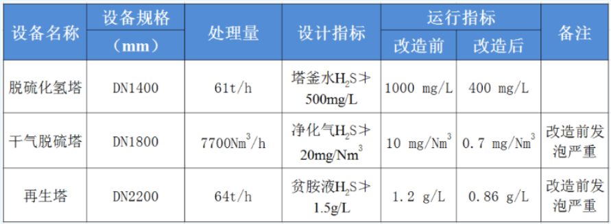 胺液是一種在濕法脫硫過程中經(jīng)常用到的溶液。由于其具有極易發(fā)泡的性質(zhì),干氣脫硫塔和再生塔在運(yùn)行過程中都存在溶劑發(fā)泡淹塔的情況。且干氣脫硫塔較為明顯,出現(xiàn)全塔壓差增大,凈化干氣帶液嚴(yán)重的現(xiàn)象。在裝置整體未達(dá)到設(shè)計(jì)負(fù)荷的情況下,再生塔存在塔頂酸性氣產(chǎn)量較設(shè)計(jì)量大帶液嚴(yán)重的情況。